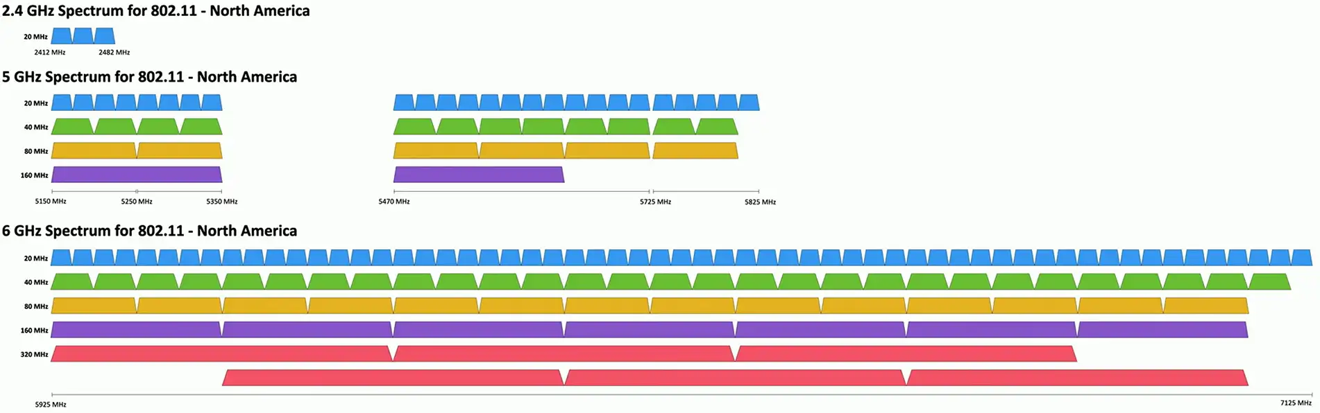- 2.4 GHz, 5 GHz, and 6GHz